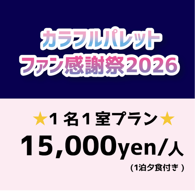 11/22(土) FC優先券発売ページです ファンクラブ以外の方は購入ができません ファンクラブ以外の方の購入がわかった場合、販売はキャンセルさせていただきます。 購入後の入会は対象外となりますのでお気をつけください カラフルパレット ワンマンライブツアー2025→2026 〜旋風を巻き起こせ〜 場所 シダックスカルチャーホール 住所 東京都渋谷区神南1-12-10 シダックス カルチャービレッジ8F 開場 14:00 開演 15:00 カラフルパレット ワンマンライブツアー2025→2026 「旋風を巻き起こせ〜東京公演〜」 A席 (指定席) 7,000円(特典付き) ーーーーーーーーーーーーーーー 最前列 SS席 (指定席) 12,000 円(特典付き) 閉演後チェキ撮影(サイン付き) S席 (指定席) 10,000円(特典付き) 閉演後チェキ撮影(サイン無し) B席 自由席 5,000円 ※お客様都合によるお申込み後のキャンセルおよび返金は致しかねます。予めご了承ください