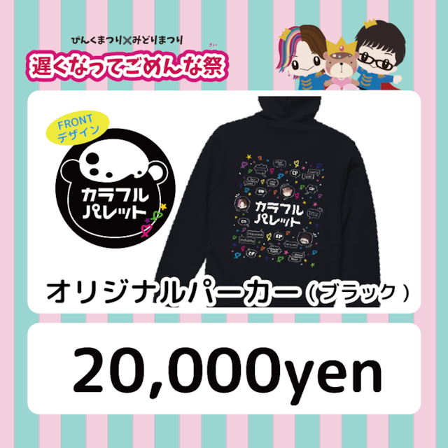 ★遅くなってごめんな祭★応援投げ銭 こちらは<オリジナルパーカー黒>購入ページです。 今回限りのオリジナルデザイン! ぜひゲットしてください! 〜遅くなってごめんな祭応援投げ銭その他返礼品紹介〜 ・1,000円 HappyNewYearポストカード ・5,000円 チェキホルダー ・10,000円 カラパレ福袋 ・15,000円 スクエアトート(ピンク・グリーン・パープル) ・20,000円 オリジナルパーカー(ブラック・グレー) ・30,000円 リクエスト歌唱動画