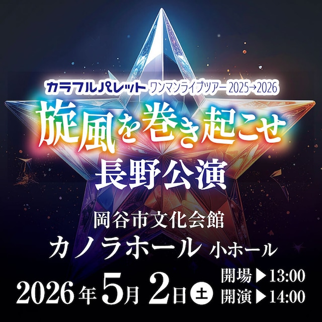 カラフルパレット ワンマンライブツアー2025→2026 〜旋風を巻き起こせ〜 長野公演 2026年5月2日(土) 開場 13:00 開演 14:00 場所 岡谷市文化会館 カノラホール 小ホール 住所 〒394-0029 長野県岡谷市幸町8−1 B席 5,000円 中学生以下/2,000円 未就学児/無料(保護者様の膝上にて鑑賞) 後日前方指定席を確約できる、グレードアップチケットを販売予定です。 ※グレードアップチケットのみでは、観覧ができません。 こちらのB席チケットはご来場にあたり必ず必要となりますので、ご注意ください。